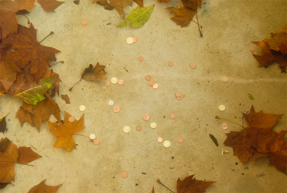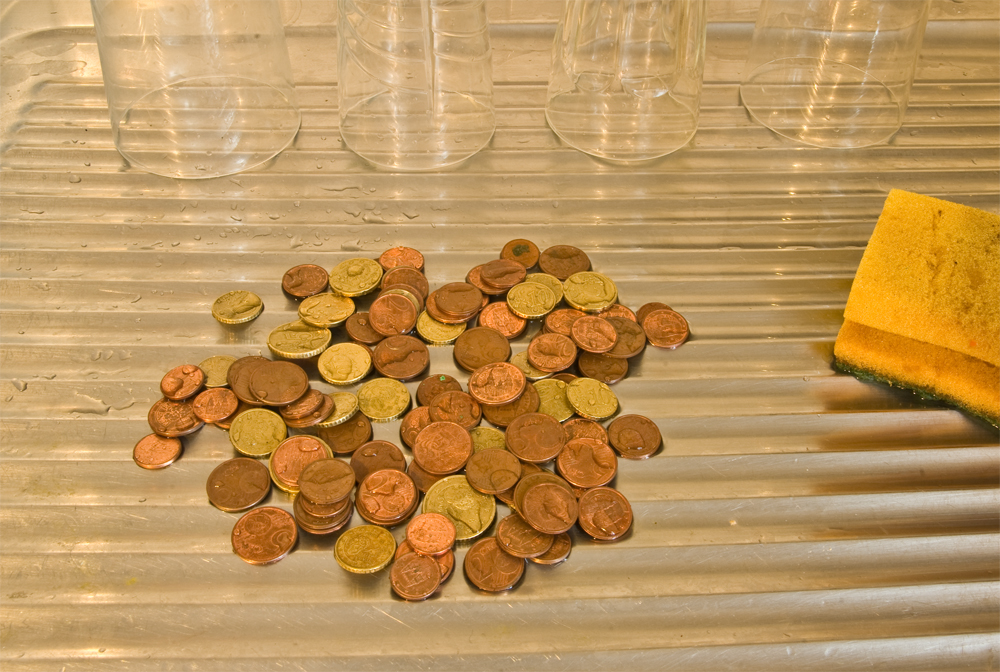 Me ha resultado un poco extraño volver a casa con los pies empapados. He preferido no contar el dinero, aunque por lo menos no todo era chatarra, y he recogido algunas monedas de 50 céntimos. Lo he dejado todo en la fregadera de la cocina para que se seque.